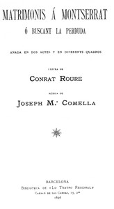 "Matrimonis a Montserrat o Buscant la perduda: Anada en dos actes i en..." de Conrad Roure és una obra còmica catalana escrita a finals del segle XIX. Ambientada durant una animada excursió al monestir de Montserrat, se centra en dos recent casats que no coincideixen —Bonifaci amb la jove Càndida i el jove Martí amb la Pona, la gran— i en Miquel, un pagès que busca ansiosament la seva dona Roseta. El to és musical i juganer, amb cors, danses i una sàtira suau d'excursionistes i funcionaris de poca monta, mentre la gelosia i el flirteig provoquen friccions còmiques. L'inici de l'obra comença en un vagó de tren ple de gom a gom amb destinació a Montserrat, on els viatgers canten, bromegen i coneixem les parelles, el jovial Narcís i Miquel, que admet que ha "perdut" la Roseta. Al monestir, l'allotjament s'organitza un al costat de l'altre, la gelosia de la Pona s'encén i, a la llum de la lluna a l'ermita dels Apòstols, un maldestre ajuntament del Bruch proporciona un toc còmic abans que tothom balli una sardana. A les escenes del restaurant, els excursionistes brinden amb vi local mentre un fotògraf s'esforça per fer un retrat de grup; la Càndida interpreta un vals, la Pona assetja en Martí i en Miquel arruïna una foto cridant "Roseta!" mentre continua buscant. Pels camins de la Cova i cap a Sant Jeroni, un cor de mariners canta en un interludi panoràmic, i en Narcís finalment porta a en Miquel notícies tranquil·litzadores a través del missatge d'un comerciant que la Roseta està bé, mentre el grup es prepara per continuar la seva excursió, alguns amb rucs, altres a peu. (Aquest és un resum generat automàticament.)