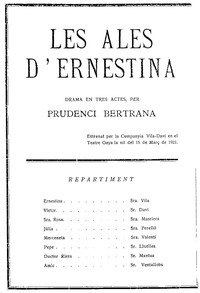 | Ampliar | Títol: Les ales d'Ernestina : Drama en tres actes Gènere: Drama Autor: Prudenci Bertrana i Comte | |